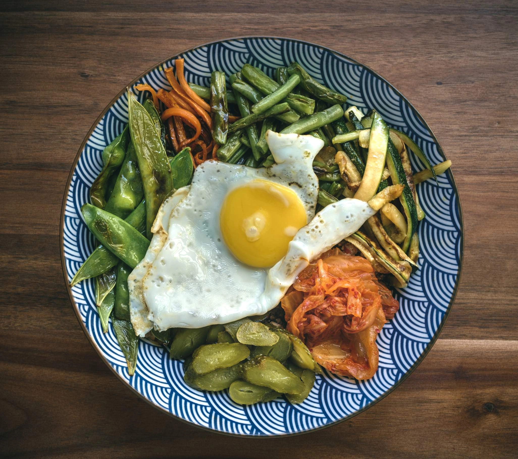 - Put the rice on the bottom of a large, deep plate. Layer the meat on top of the rice with all its juice. Put all the fillings over the meat: vegetables, pickled cucumbers, kimchi. Place the fried egg in the middle. Sprinkle with freshly ground sesame seeds.
