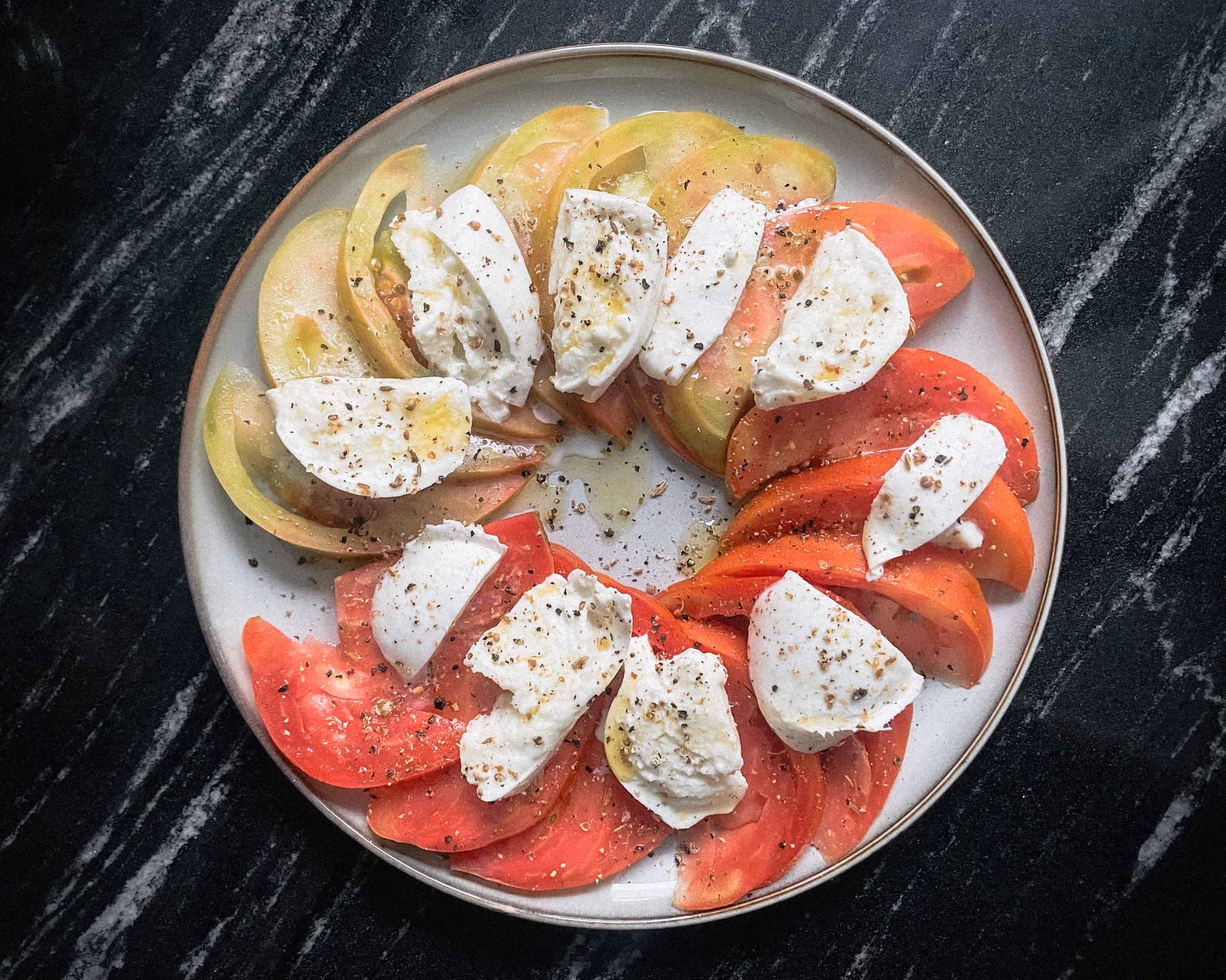 This salad is ridiculously quick to make and is the best way to use big ass Valencian tomatoes when they’re in season. One tomato is usually enough to make two plates like this — they’re that huge. It’s fresh, juicy, and full of summer flavors.
