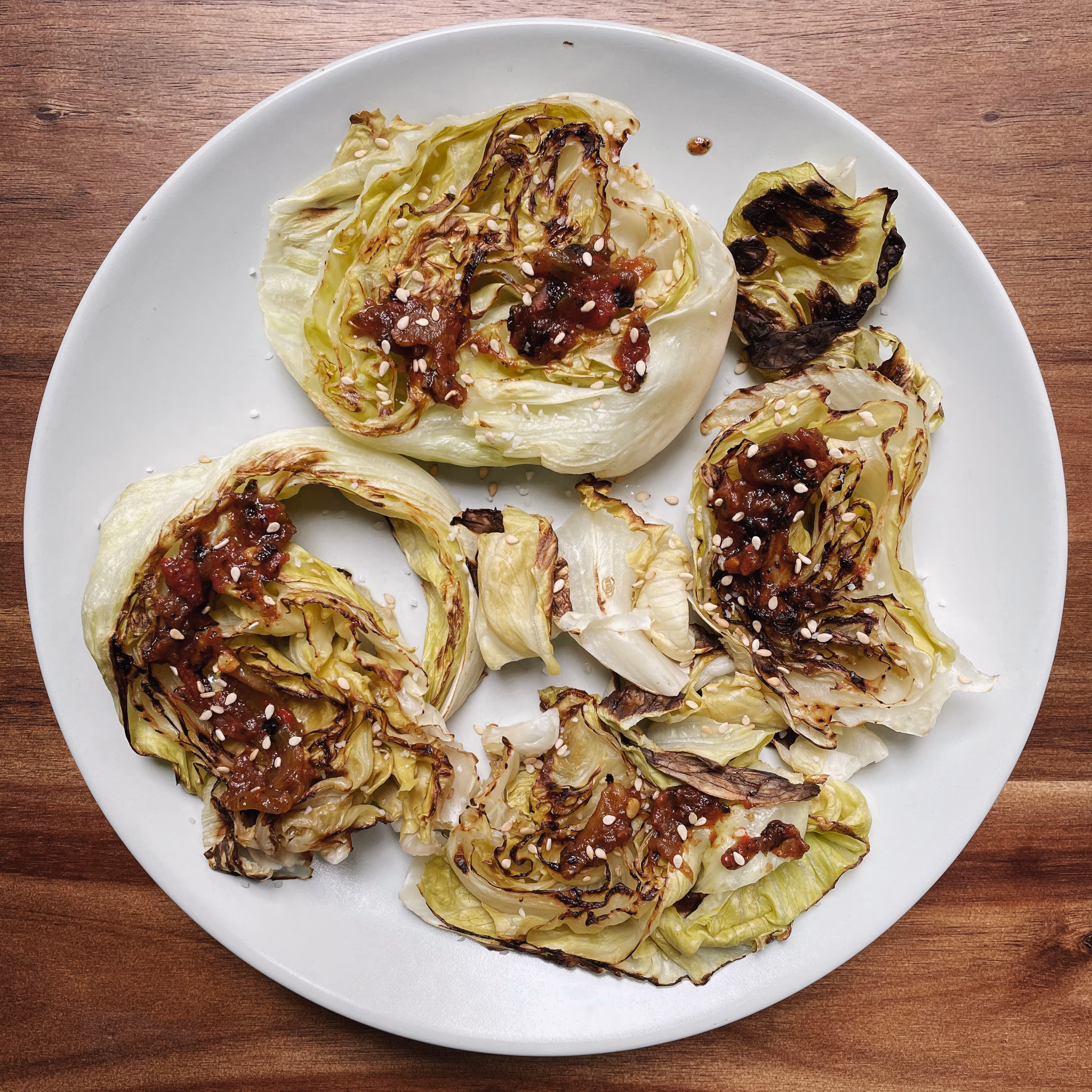 If you have a retired iceberg salad at the back of your fridge that’s too old for an actual salad, in 10 minutes you could make a nice snack. Works great with Salsa roja tatemada, but could be served with any other sauce you have: Pesto, or even a salad dressing.