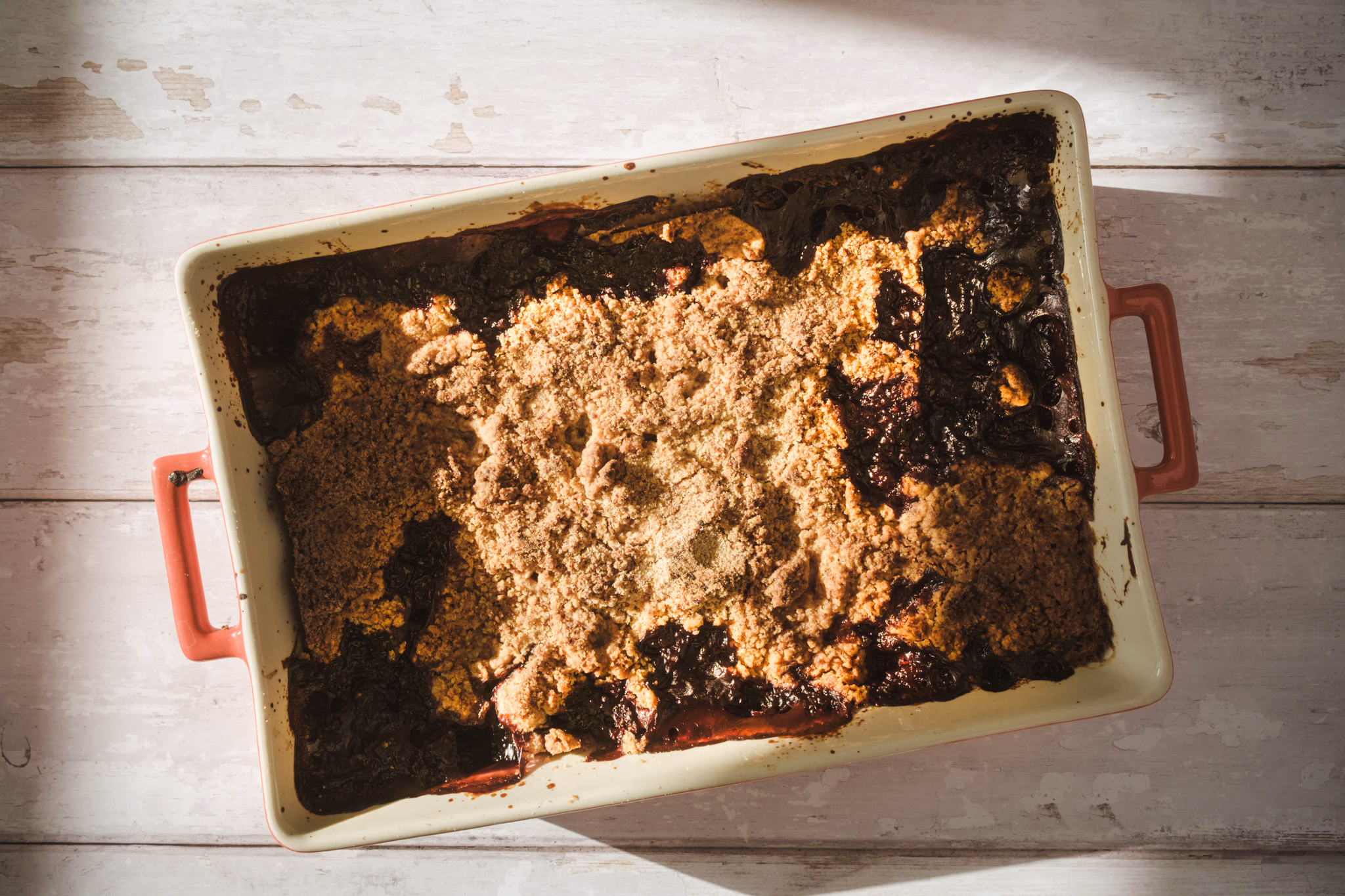 - Take the dough by a handful, squeeze it to compress, and spread on top of the berries as small crumbs.