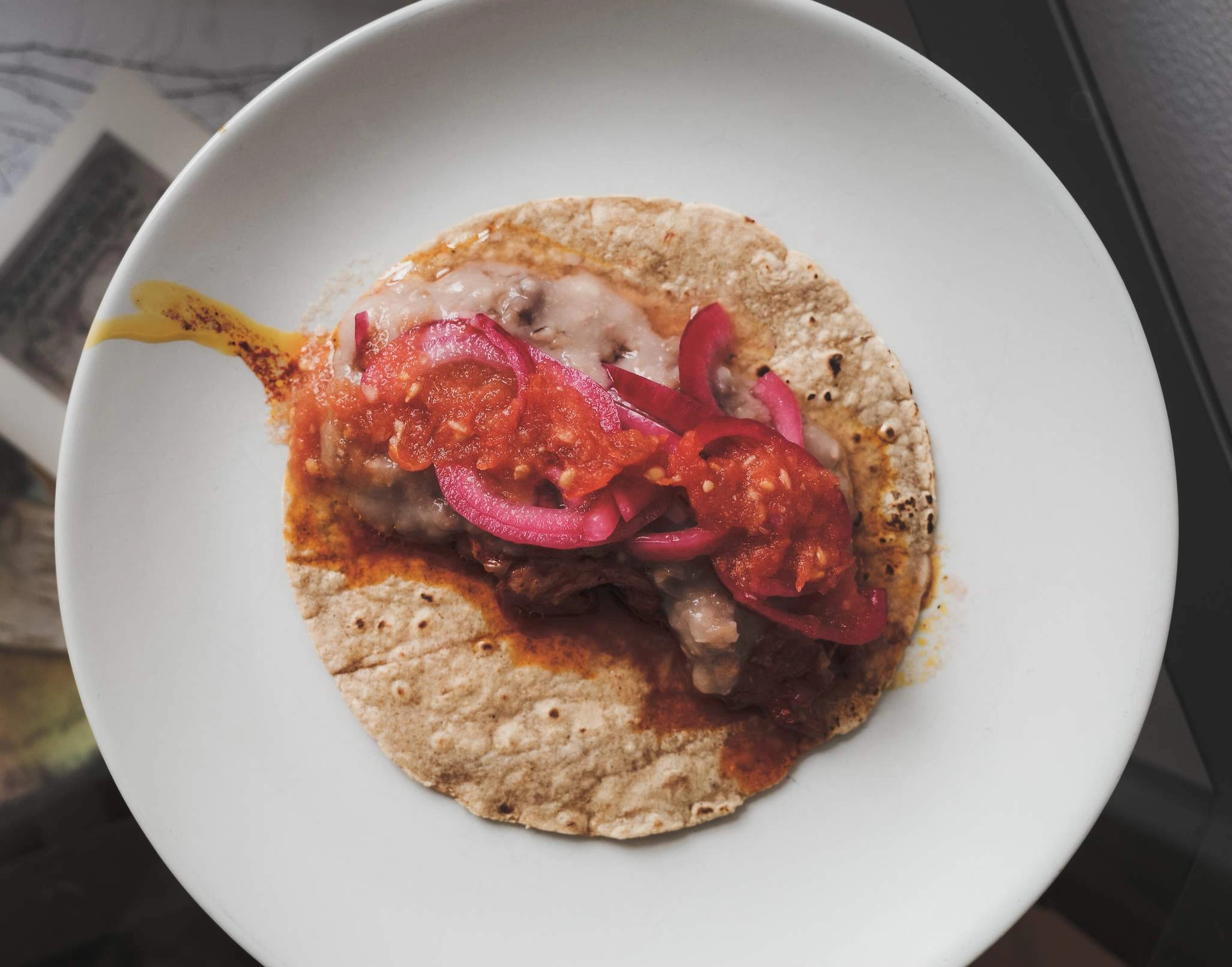 - Serve all the ingredients — tortillas, avocado, cochinita pibil, pickled onions, frijoles refritos, and salsa roja tatemada — separately, so everyone could assemble the taco of their dreams (this also prevents tortillas to become soaked and break).