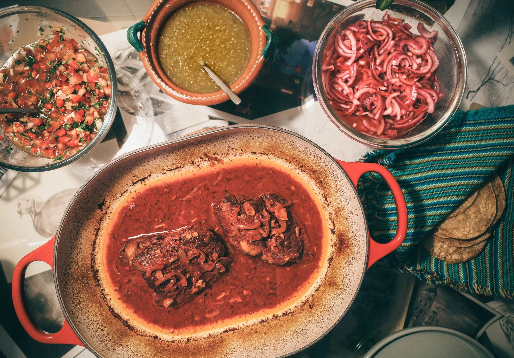 Cochinita pibil is a legendary Mexican dish, known for being full of flavors and traditions, and typically is cooked underground using maguey leaves. The version here is a very simplified way of cooking it at home, which basically only calls for some supervision during the preparation. It is perfect for those days when one is working at home, since after marinating the meat overnight, you only need to cook it in the oven for some hours.