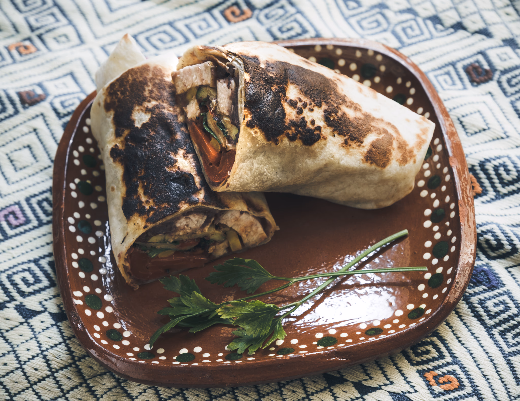 - Assemble the dönerritos: spread the frijole sauce in the middle-low section of the tortillas, place the chicken pieces and vegetables on top of the frijol sauce, spread the salsa roja tatemada on top of the chicken and vegetables, and top everything with parsley. Now roll the tortilla: flip the lower part over the filling, flip the sides, and tightly roll from the bottom.