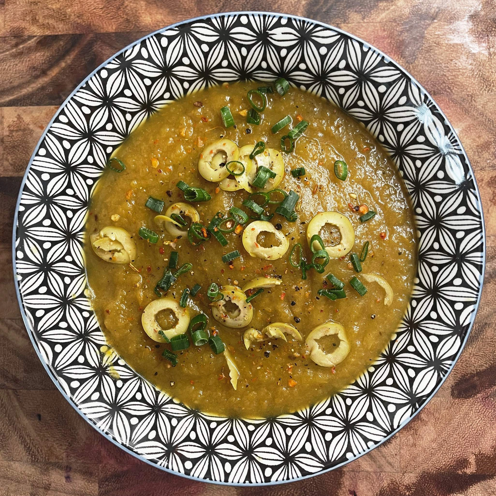- Serve with thinly chopped olives and green onion.