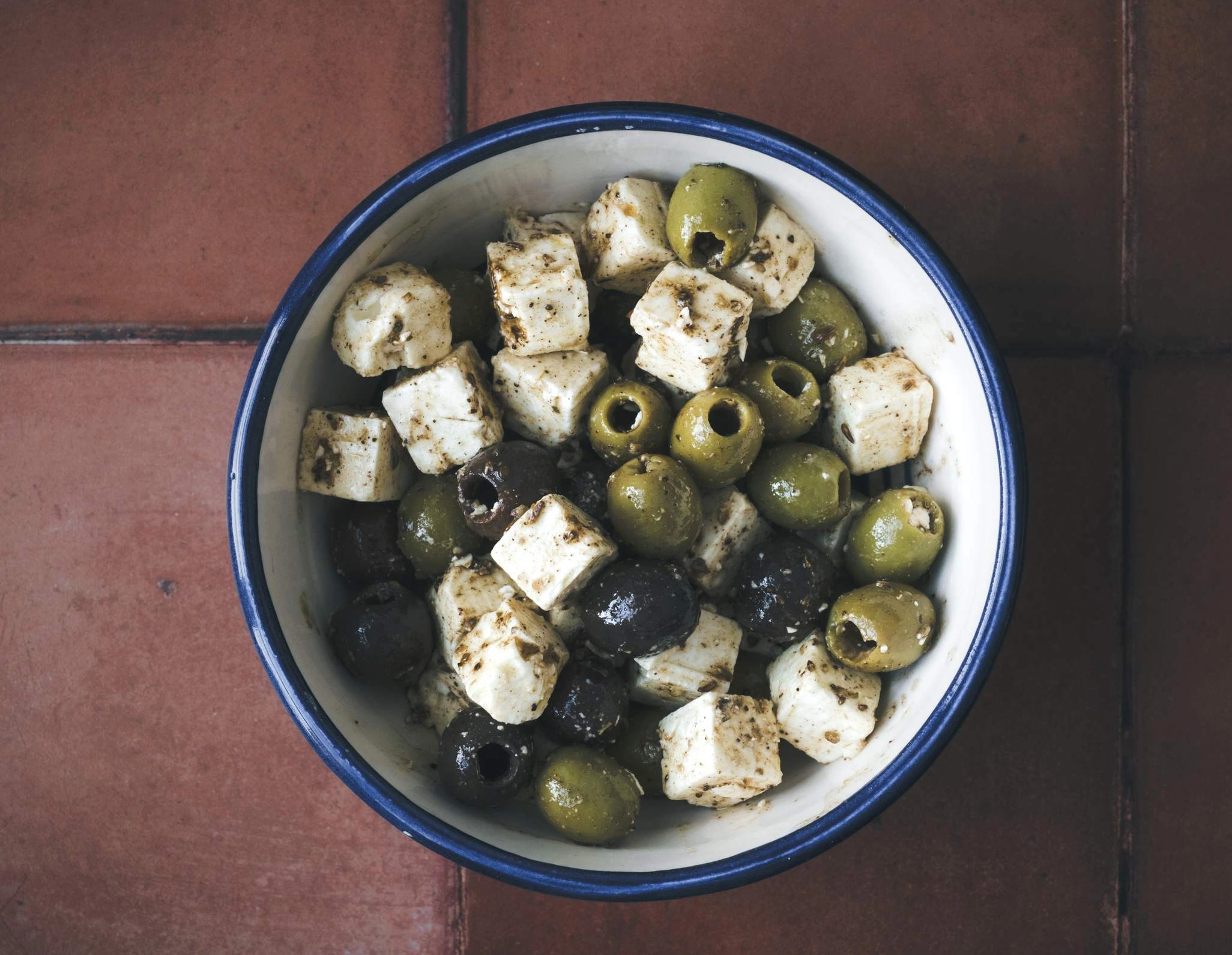 - In a bowl, add the feta cheese, olives, and a bit of olive oil.