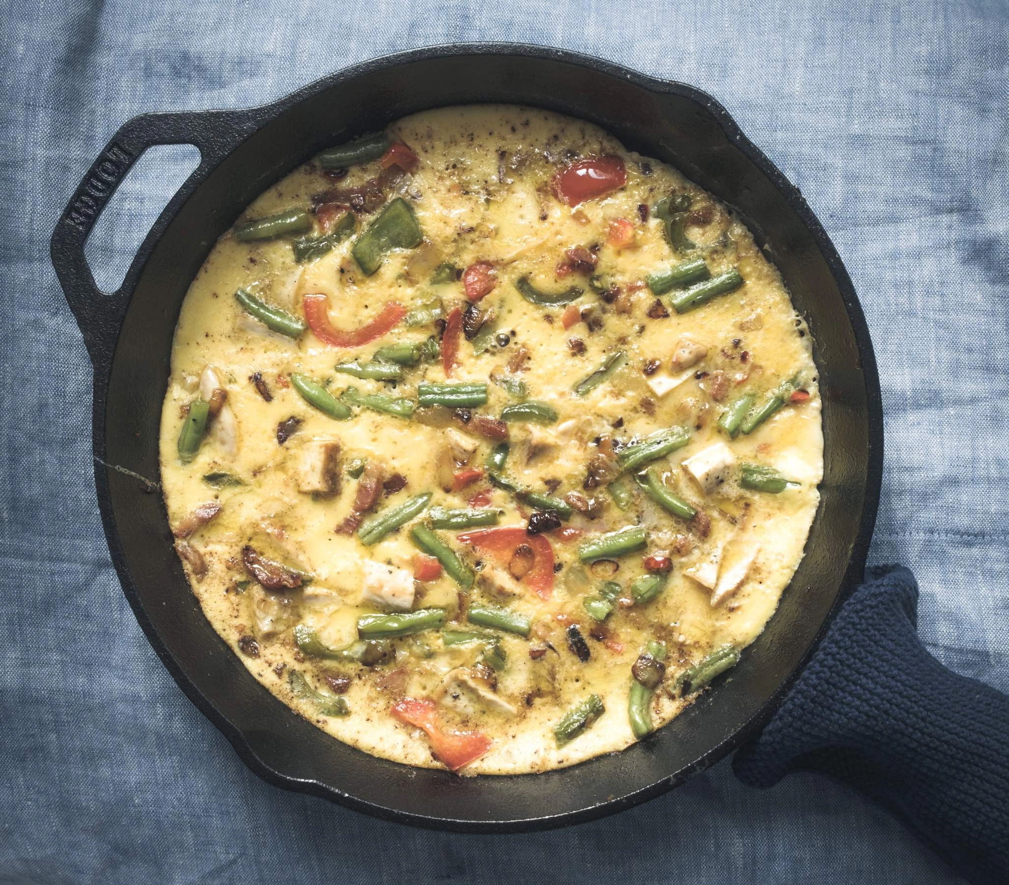 This is the perfect brunch dish to eliminate leftovers in your fridge, and also quick to cook. Half of a bell pepper? Quarter of a zucchini? Cooked meat from lunch yesterday? Put it all in!
