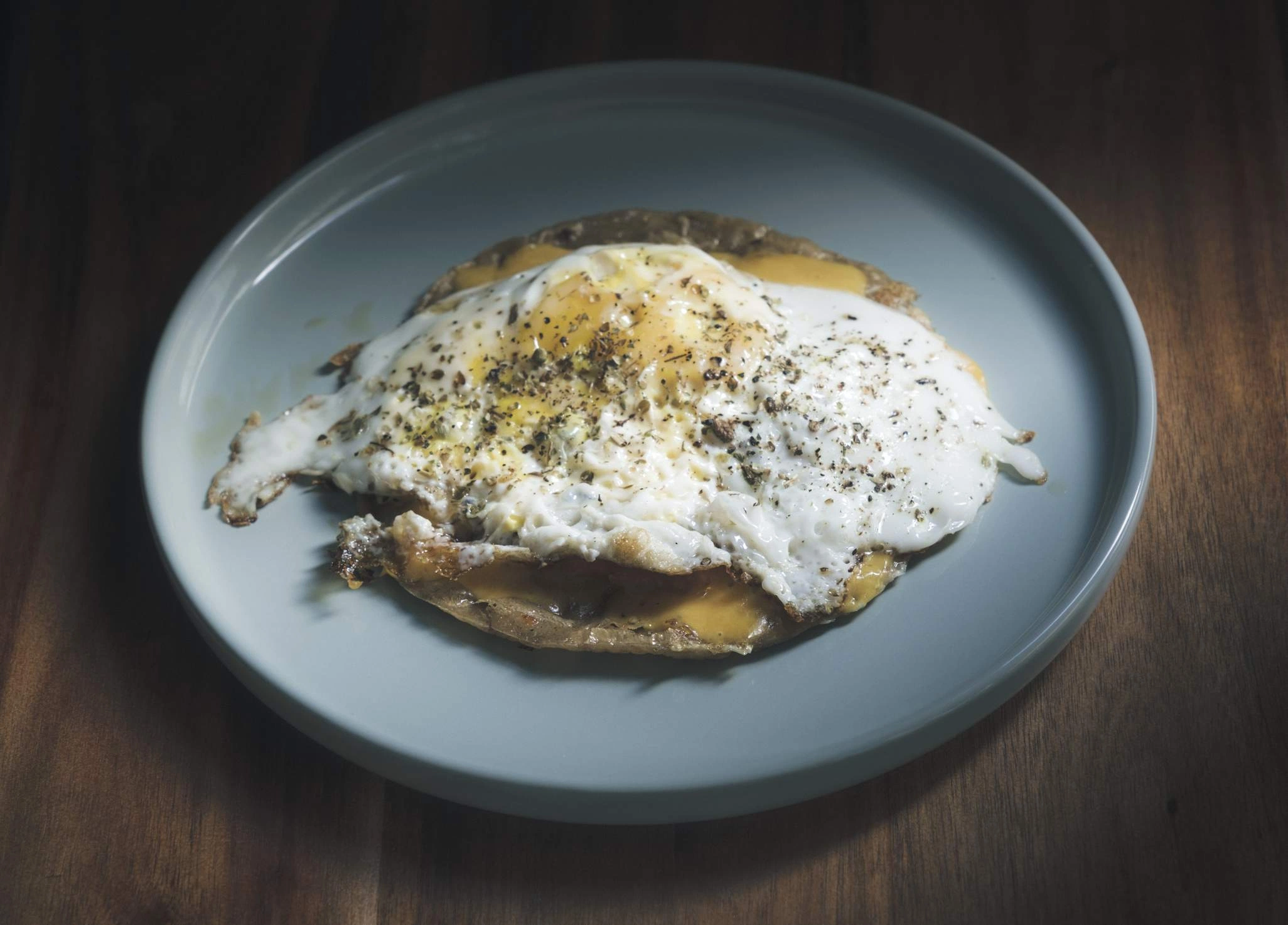 - Put a tortilla on one side of the skillet, and break an egg onto another side. Season the egg with a bit of salt, black pepper, and oregano.