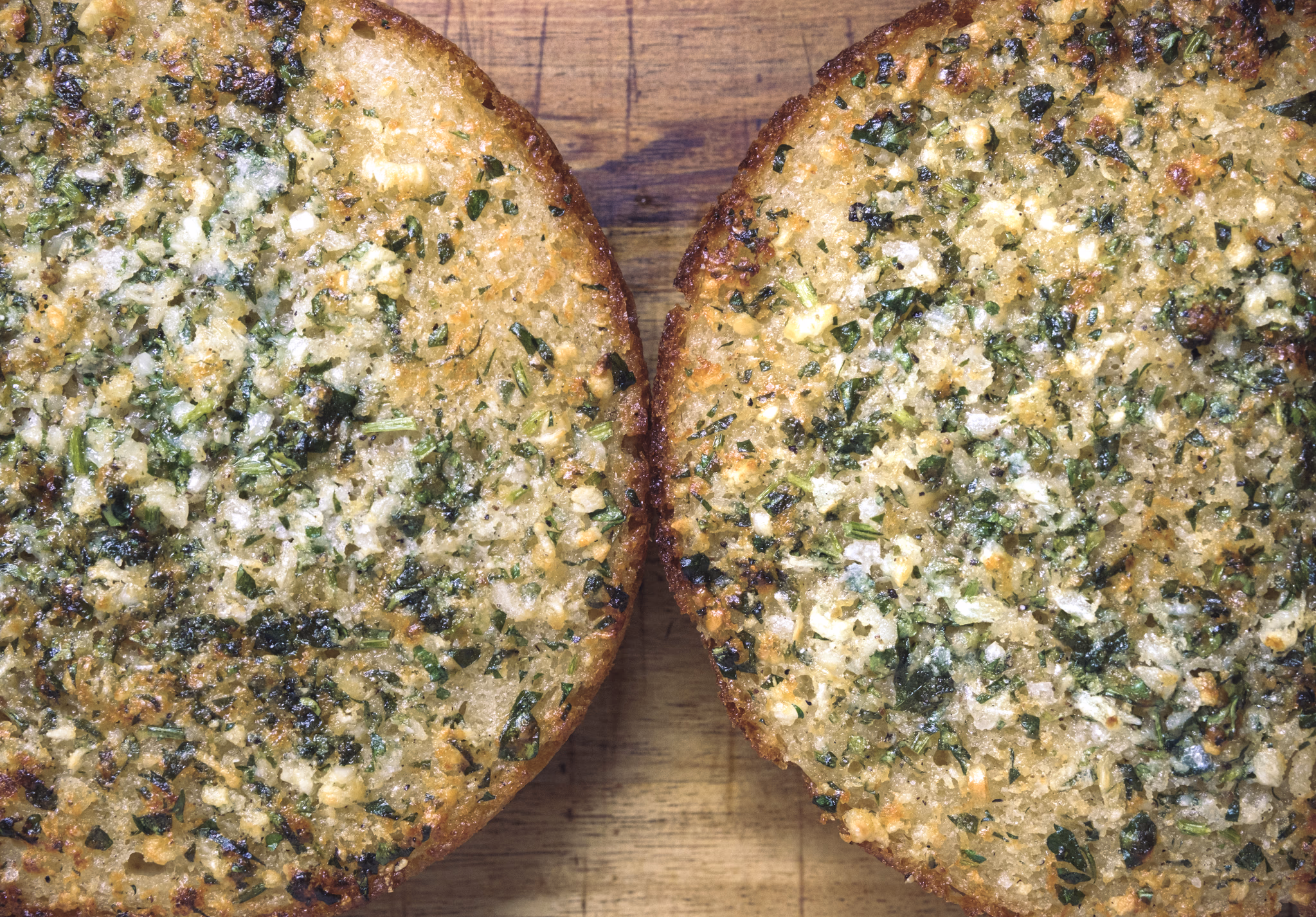 This is a perfect Sunday breakfast recipe — the smell and the taste of just baked garlic bread are amazing. You could do it with any kind of bread, we like to make it with our own easy bread, baked the evening before.