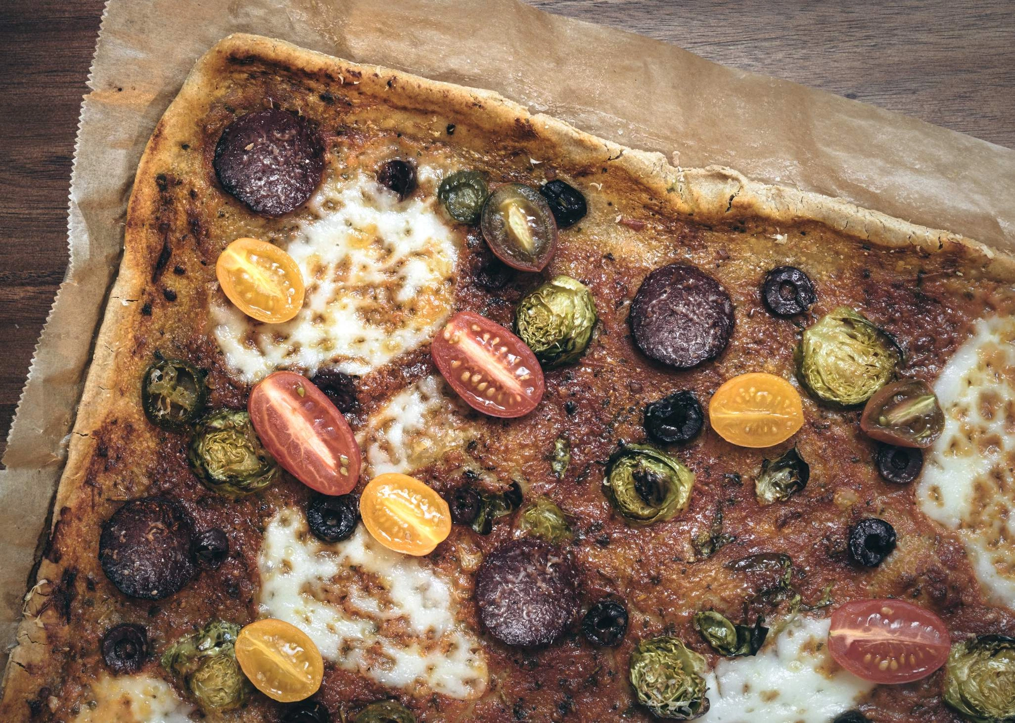 The pizza made with this dough looks and tastes like a regular wheat-flour pizza: crispy and crunchy and tasty and awesome. Try it with our pizza sauce.