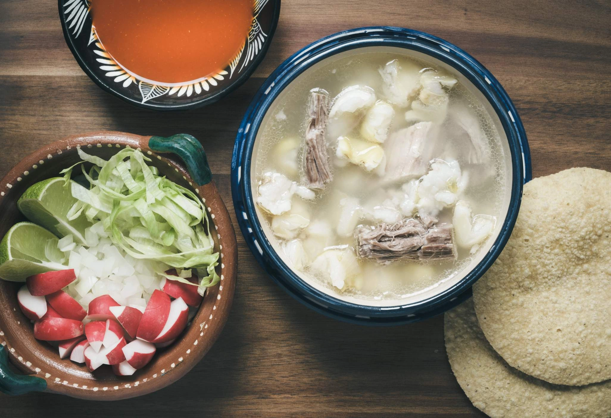 - Serve the pozole plain with all the garnishes — salsa chili de árbol, iceberg salad, radishes, onions, and limes — on the side, so each person can choose what they like and how much.