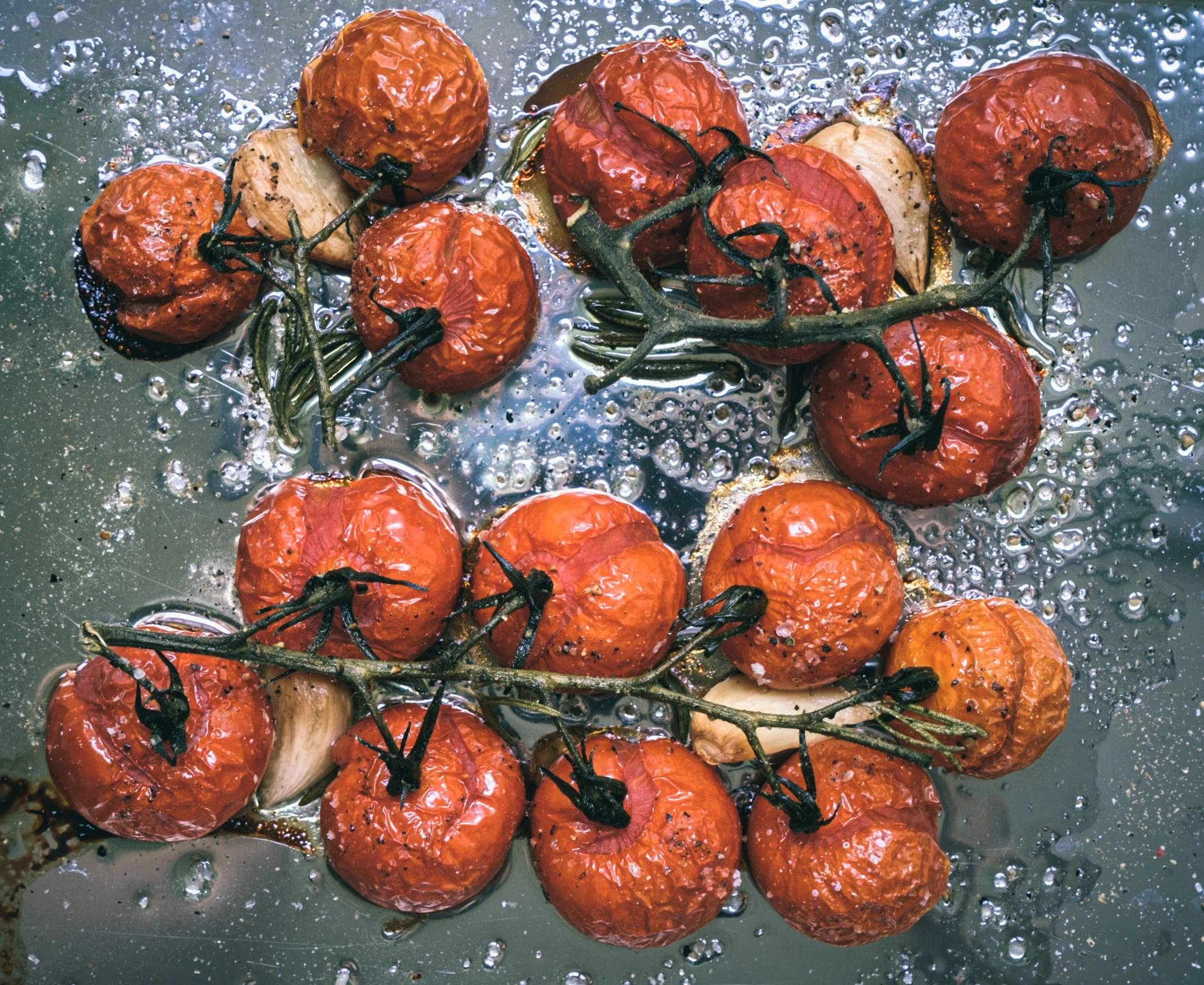 - Roast tomatoes until they crack and are very wrinkled but still juicy inside, for about 2 hours.