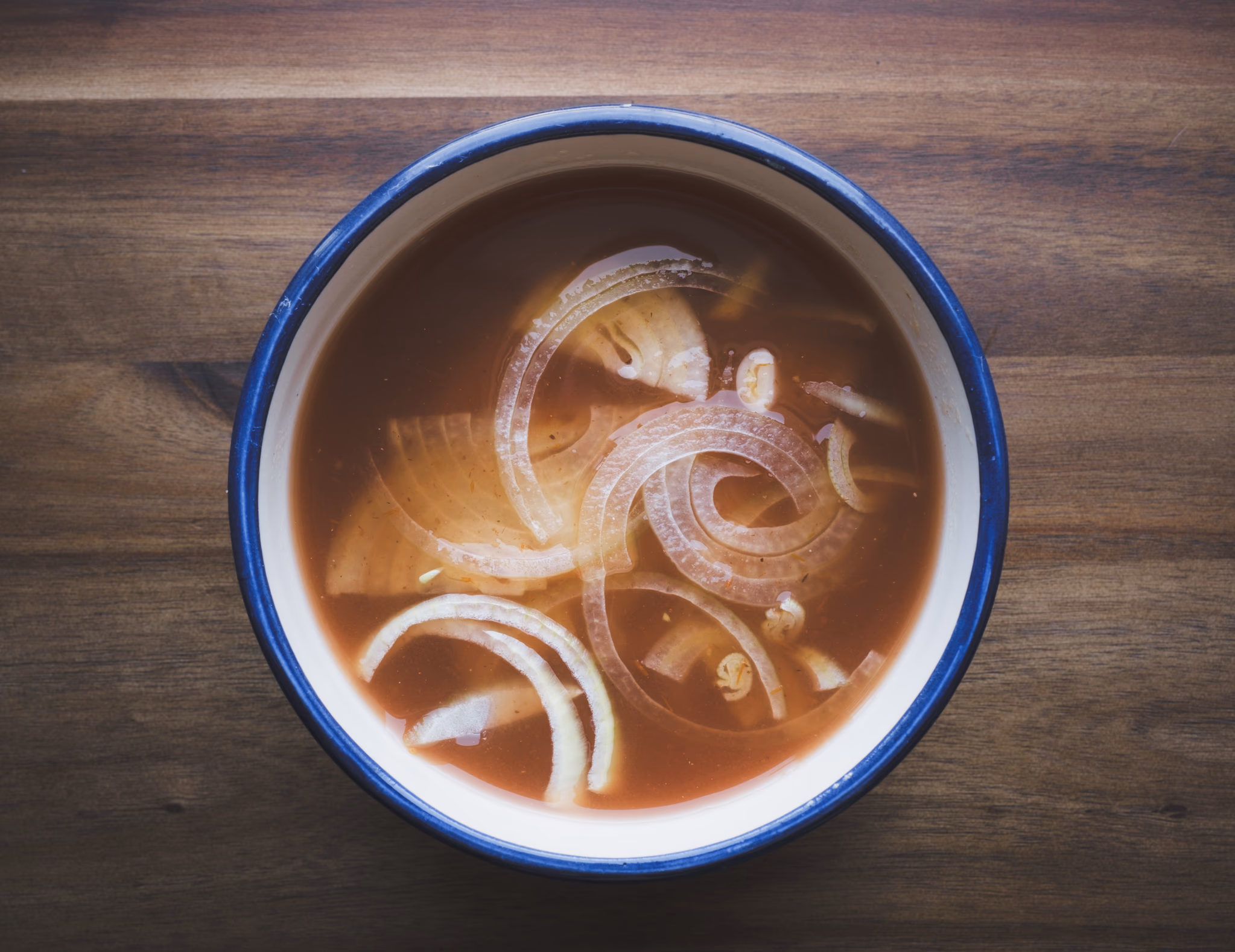 - While the tomatoes are cooking, peel the onion, halve it and thinly slice.