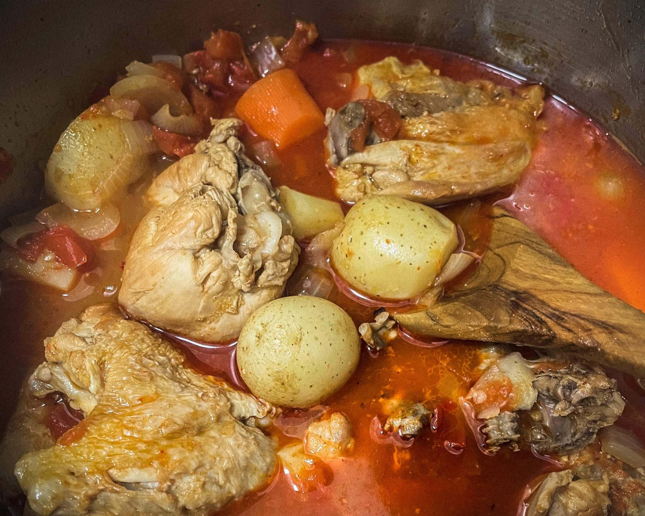 This recipe produces tender, flavorful chicken with bright and spicy sauce and lots of vegetables. It’s also a great way to use a whole chicken in a single dish.