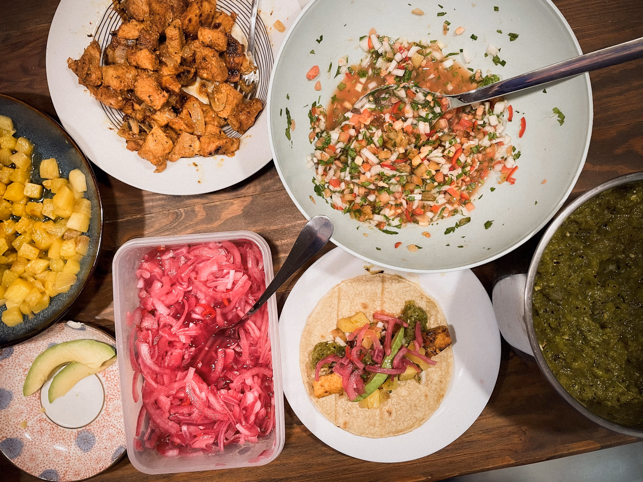 - Serve all the ingredients separately: meat, tortillas, avocado, pineapples, pico de gallo, salsa verde, and pickled onions, so everyone can assemble a taco of their dream.