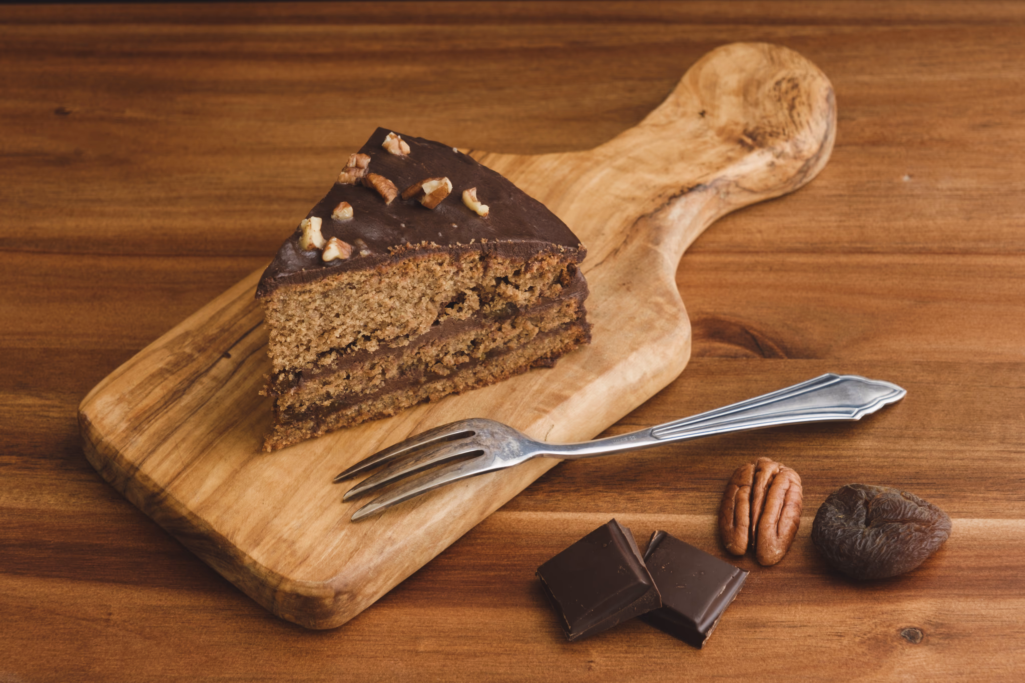 - Once you have all the bread covered with a medium-thick chocolate layer, sprinkle some pecans (roughly chopped into small pieces) to decorate. Then let the cake cool down before serving in a refrigerator.