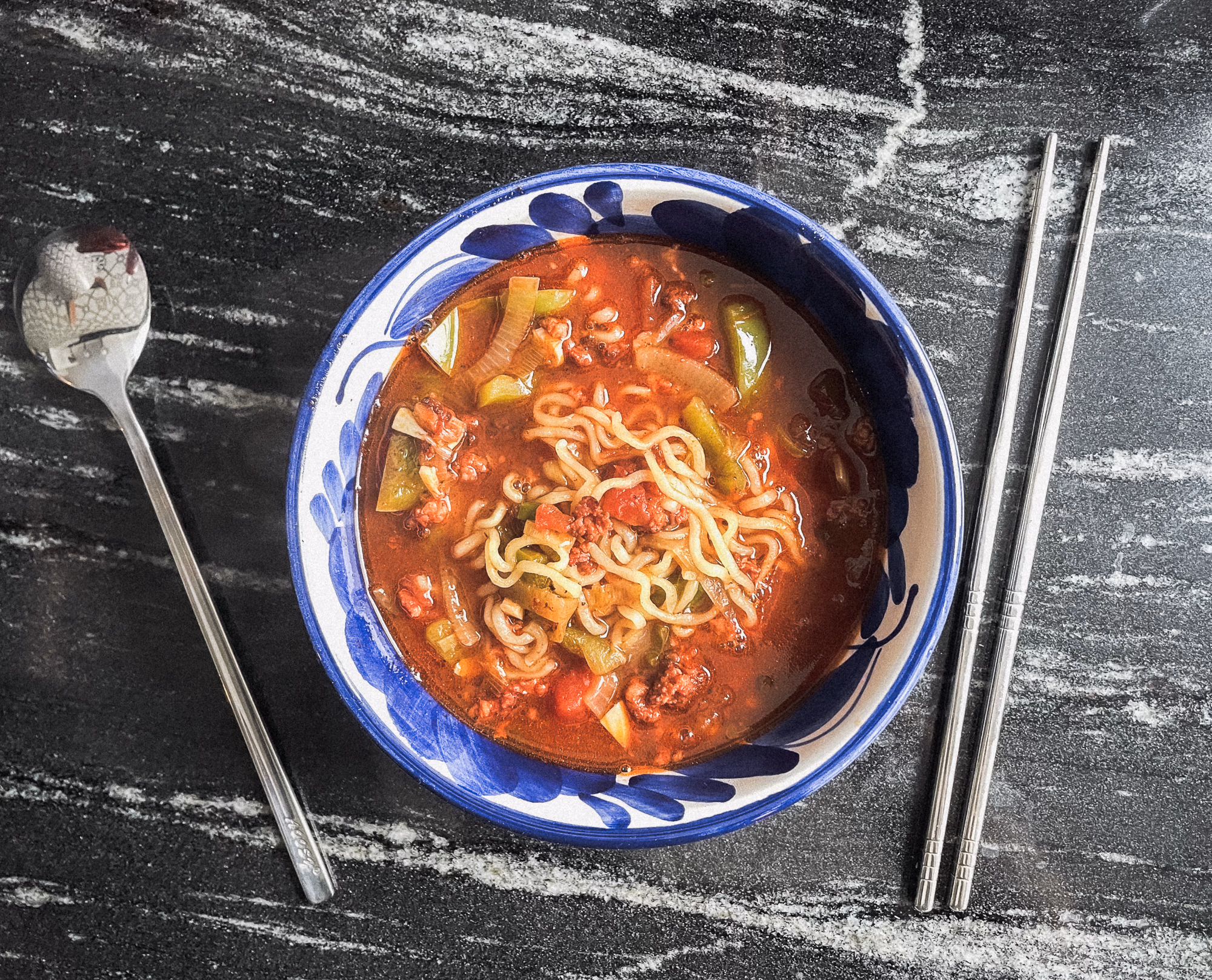 This is a great recipe to quickly satisfy your noodle cravings and warm you up in winter, have a quick lunch on a working day, or pay respect to His Noodliness. Also, it reminds Artem of his first job in a computer lab as a student, where a cup of instant Asian noodles was a common, though far less healthy and enjoyable, lunch option.